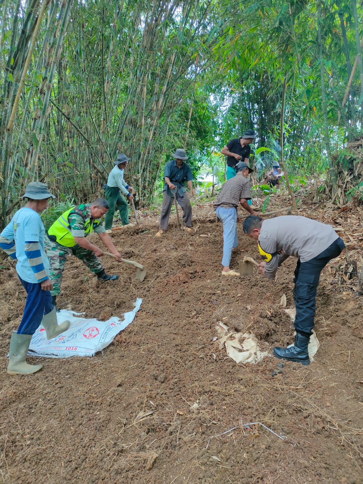 Nampak Batuud Koramil 2209 Lengkong Sertu Taslin bersama dengan anggota Polsek dan warga sekitar tengah sibuk membersihkan area yang akan dibuat jalan.