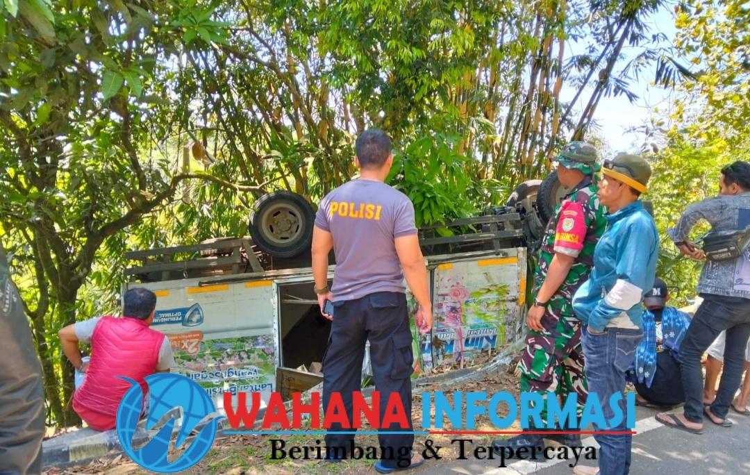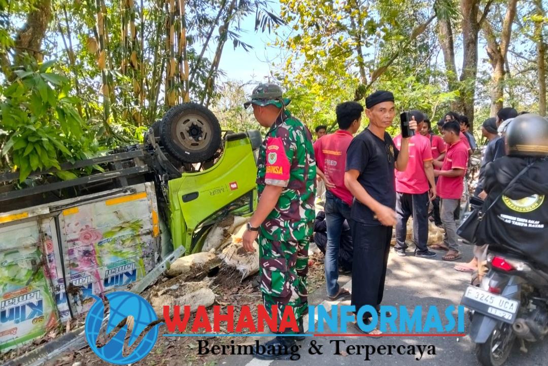Diduga Rem Blong, Mobil Box Bermuatan Barang Kelontong Terguling di Waluran
