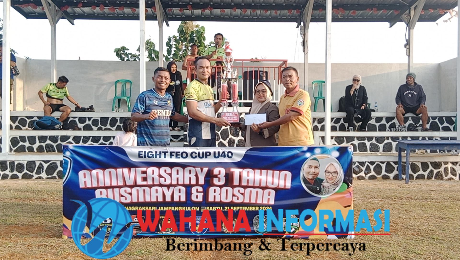 Wahanainformasi.com- Kesebelasan PCP FC keluar sebagai juara pertama turnamen Sepak bola usia 40 tahun ke atas dalam rangka Eight Fao Cup U 40 Aniversary 3 Tahun Rusmaya dan Rosma, dilapangan Tegalboled Desa Nagraksari, Kecamatan Jampangkulon, Kabupaten Sukabumi, yang diikuti 8 tim kesebelasan dari beberapa daerah.