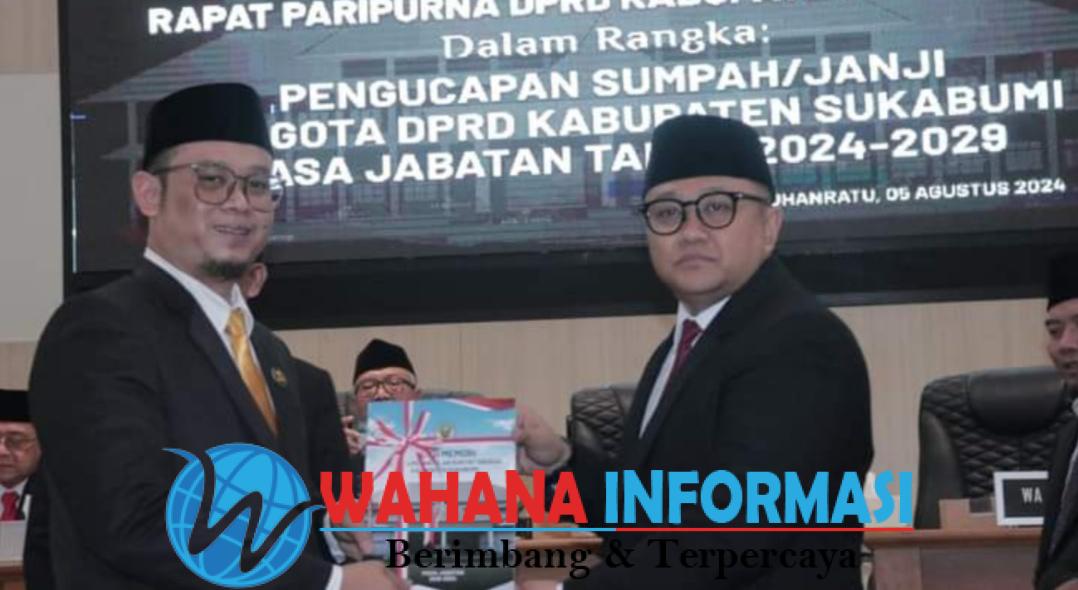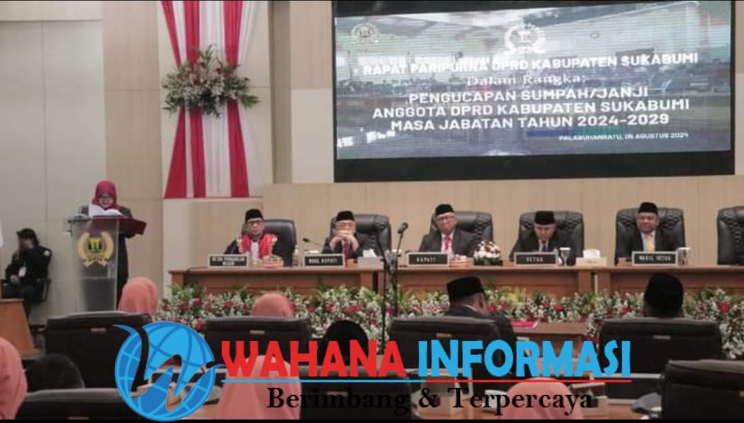 wahanainformasi.com – Kabupaten Sukabumi – Sebanyak 50 Anggota Dewan Perwakilan Rakyat Daerah (DPRD) Kabupaten Sukabumi periode 2024-2029 dilantik dan diambil sumpah janji jabatan, di Aula DPRD Kabupaten Sukabumi, Senin (5/8/2024). Prosesi pelantikan dihadiri Bupati Sukabumi H Marwan Hamami yang didampingi Wakil Bupati H Iyos Somantri.