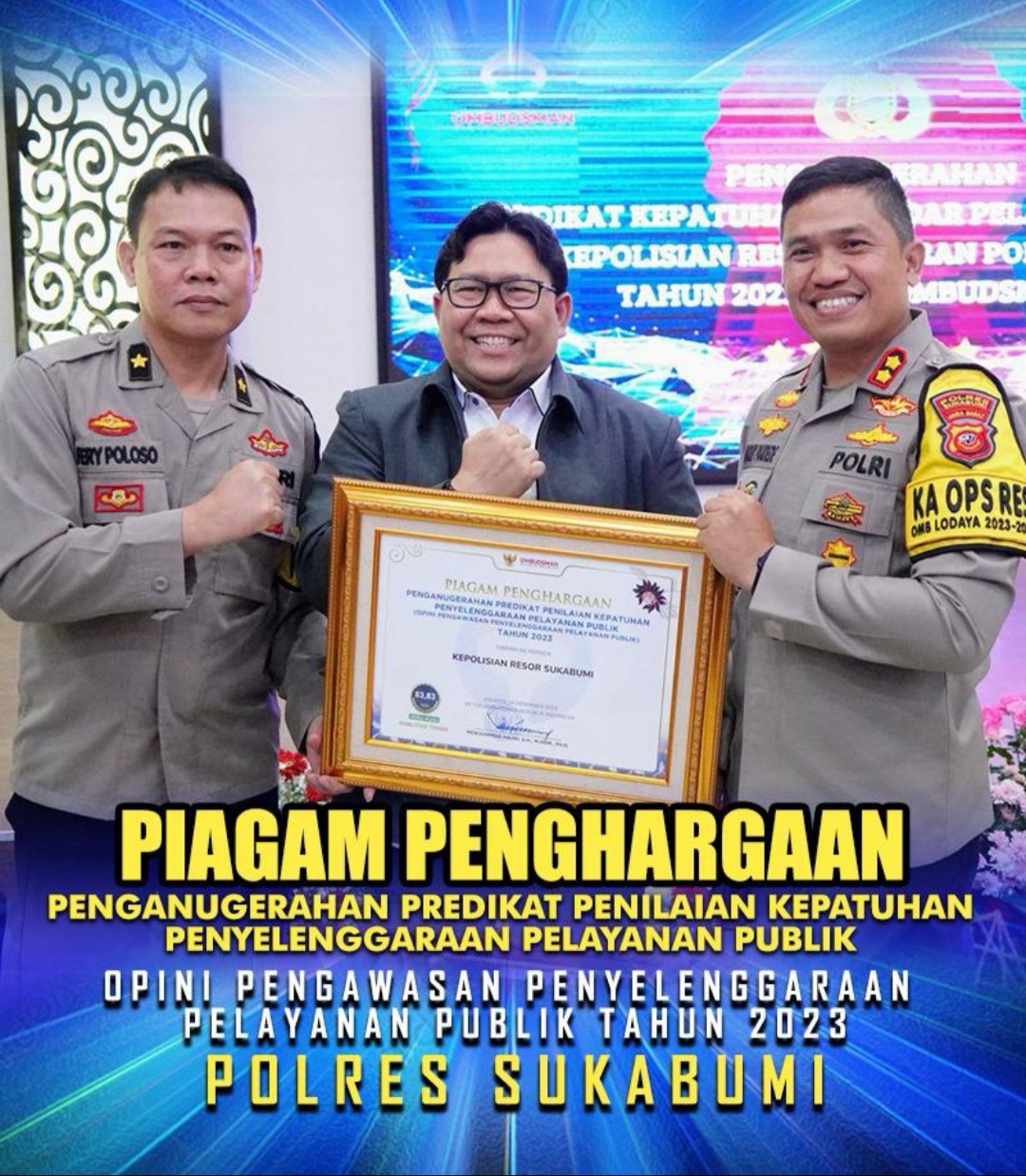 wahanainformasi.com, – Sukabumi – Kapolres Sukabumi, AKBP Maruly Pardede, mengukir prestasi gemilang dengan meraih piagam penghargaan bergengsi dari Ombudsman Republik Indonesia. Penghargaan tersebut diberikan sebagai bentuk pengakuan tertinggi terhadap kepatuhan dan penyelenggaraan pelayanan publik yang luar biasa oleh Polres Sukabumi.